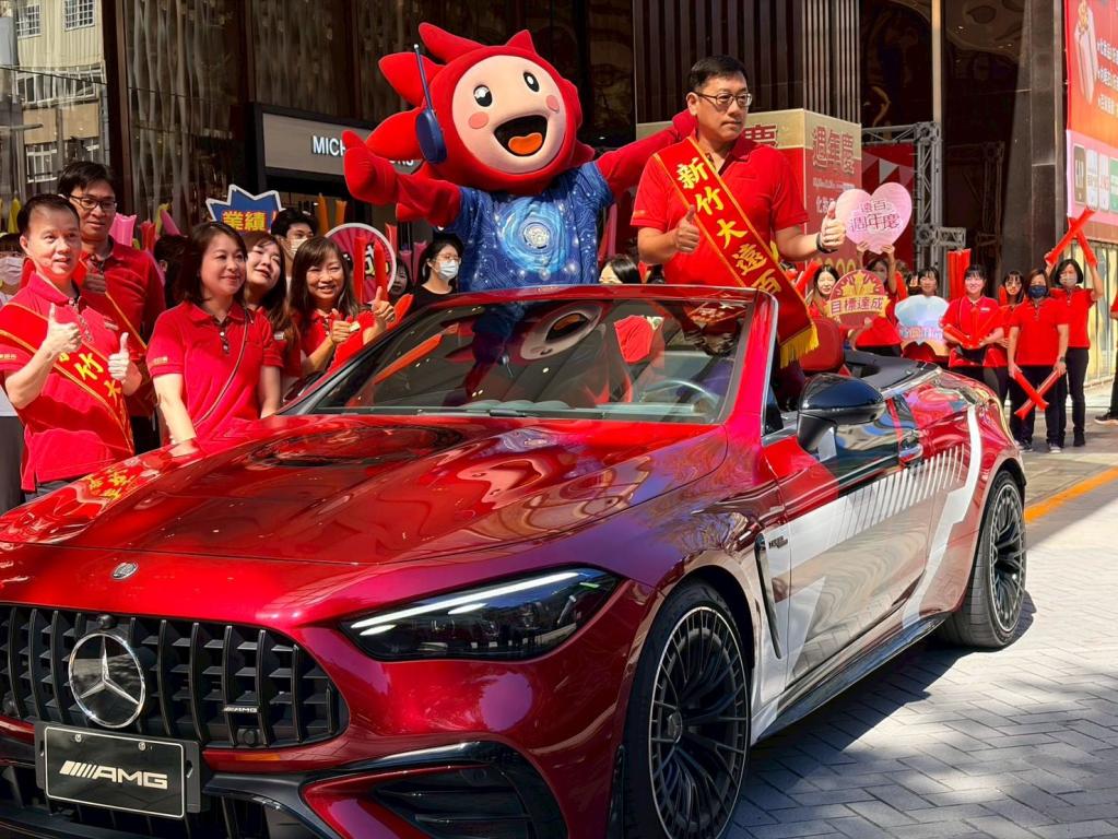 ▲新竹大遠百週年慶預購開跑!新竹大遠百盛大舉辦週年慶造勢大會,新竹大遠百李正方店長與太陽寶寶乘座賓士超跑進場,為即將開打的週年慶揭開序幕!(圖/新竹大遠百提供)