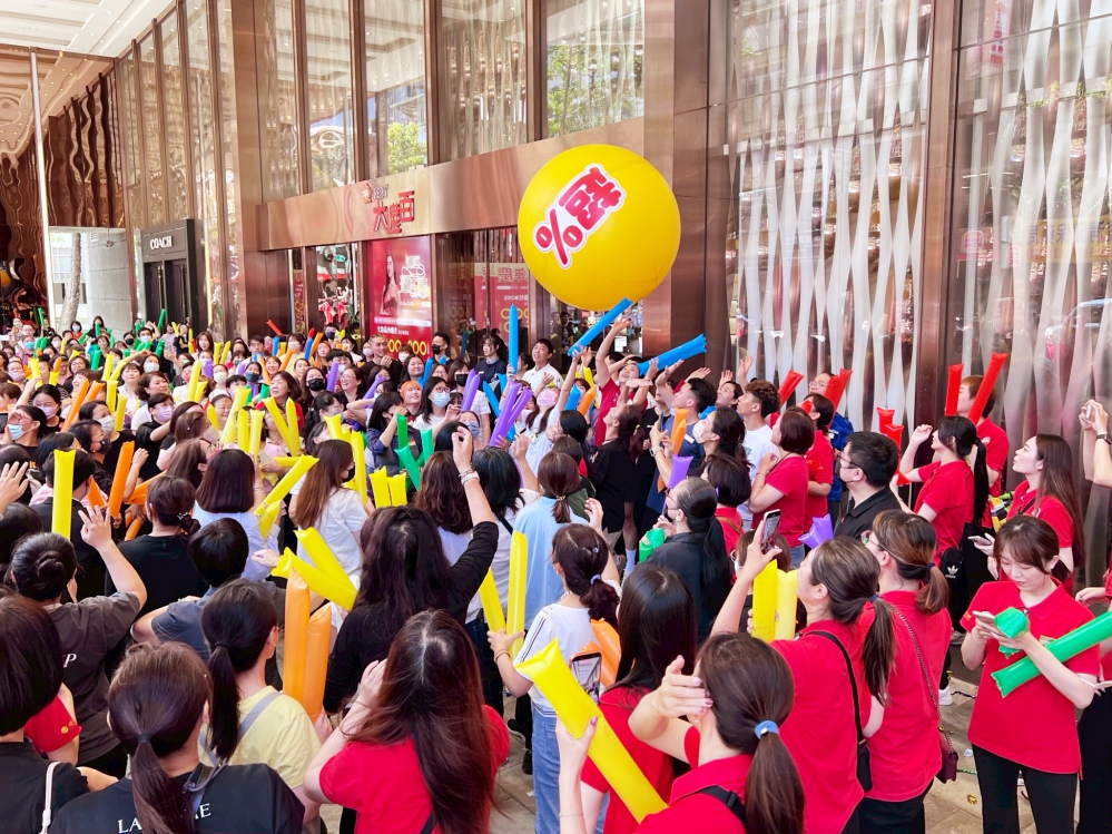 ▲新竹大遠百週年慶預購開跑!新竹大遠百盛大舉辦週年慶造勢大會,現場約500人共同推向超%球,大家一起高喊10億業績勢在必得!(圖/新竹大遠百提供)