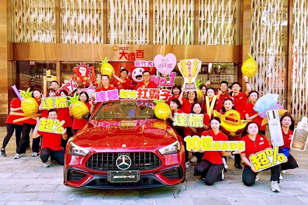 ▲新竹大遠百週年慶預購開跑!新竹大遠百盛大舉辦週年慶造勢大會,李正方店長、林家榕副店長和太陽寶寶一同乘座賓士,與團隊同仁們合影,大家一起高喊10億業績勢在必得!(圖/新竹大遠百提供)
