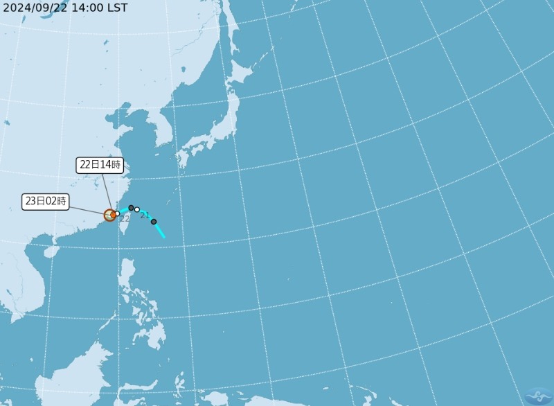 22日14時的中心位置在北緯 24.9 度,東經 119.1 度,以每小時5公里速度,向西南西進行。中心氣壓1002百帕,近中心最大風速每秒12公尺,瞬間最大陣風每秒 20 公尺。