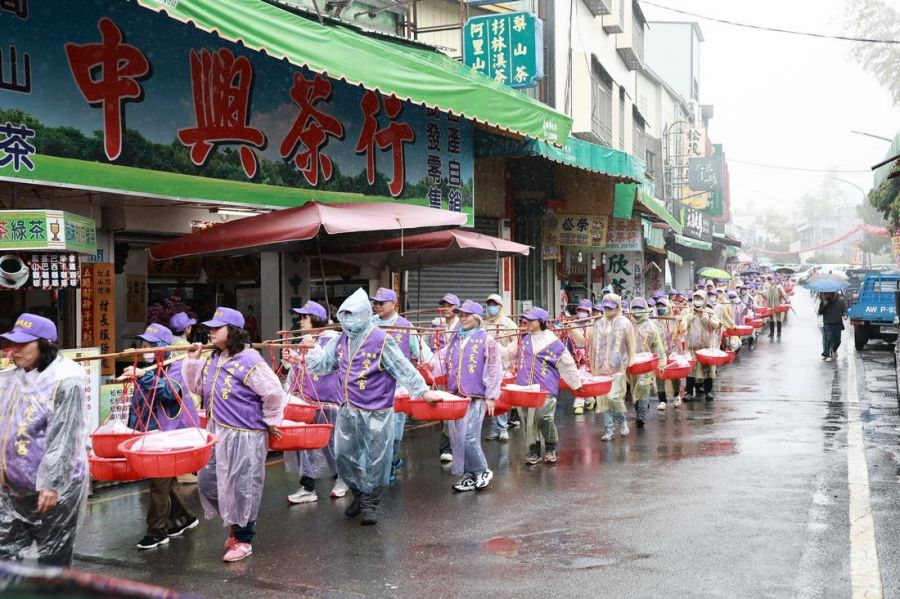 300位信眾志工一起以扁擔扛米糕桃徒步到受天宮祝壽。(縣府提供)